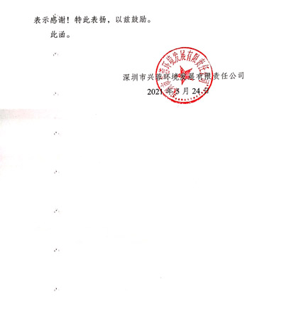 深圳興蓉環(huán)境發(fā)展公司致我司的一封表揚(yáng)函