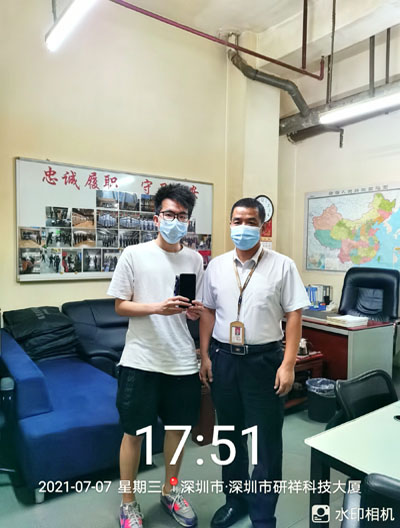 我是研祥科技大廈6樓文思海輝員工林先生,2021年7月7日下午15點左右,我在研祥科技大廈一樓大堂休息時不慎將一部真我牌手機(價值2299元),遺失在沙發上,回公司近四個小時后才發現手機丟失,然后到大堂尋找未果,經多方打聽才知道是大堂執勤保安員徐濤在巡查時發現,并立即上交隊長保管等待失主認領,后經隊長核實無誤后歸還給我,失而復得,萬分感激。