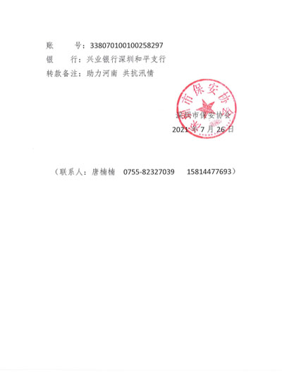 災害發生以后,全國各地力量迅速響應,社會各界紛紛伸出援手。深圳市保安協會號召全體會員單位,為災區人民提供力所能及的資金援助,凝聚八方愛心,幫助受災同胞重建家園,助力河南抗洪救災一線。此次所募善款,將全部通過深圳市慈善會捐贈,用于救助河南省受災群眾。
