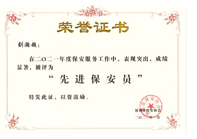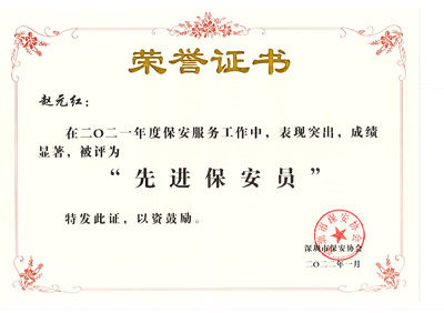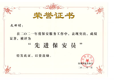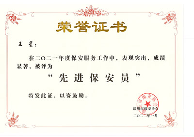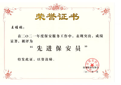 深圳市鐵保宏泰保安服務有限公司多名安保護衛人員被深圳市保安協會熱評為“先進保安員”。